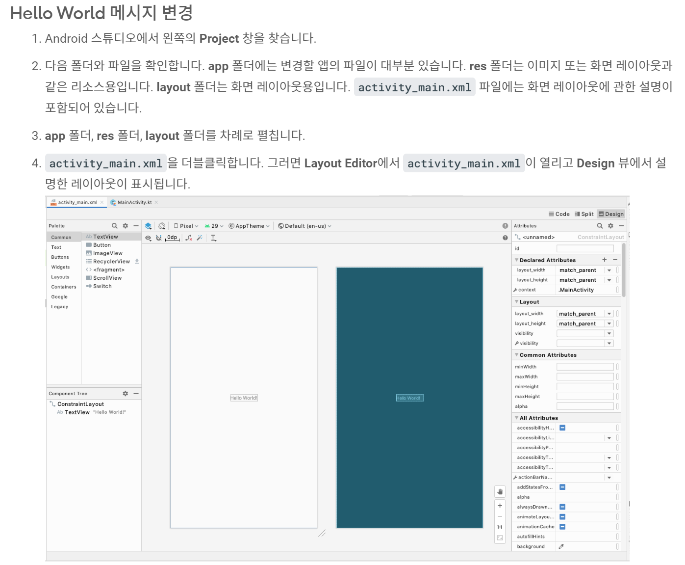 이제 용어 설명 이후에 안드로이드 스튜디오에서 View와 Layout 같은 화면들을 설정하는 방법에 대해 설명이 되어있습니다. 이것은 어려운 부분이 아니라고 생각되어 넘어가겠습니다. 천천히 읽어보시고 급하게 빠르게 이것저것 막 눌러보는 것보다 한 줄 한줄 읽어가면서 알려주는 대로 따라 하시는 걸 추천드립니다.