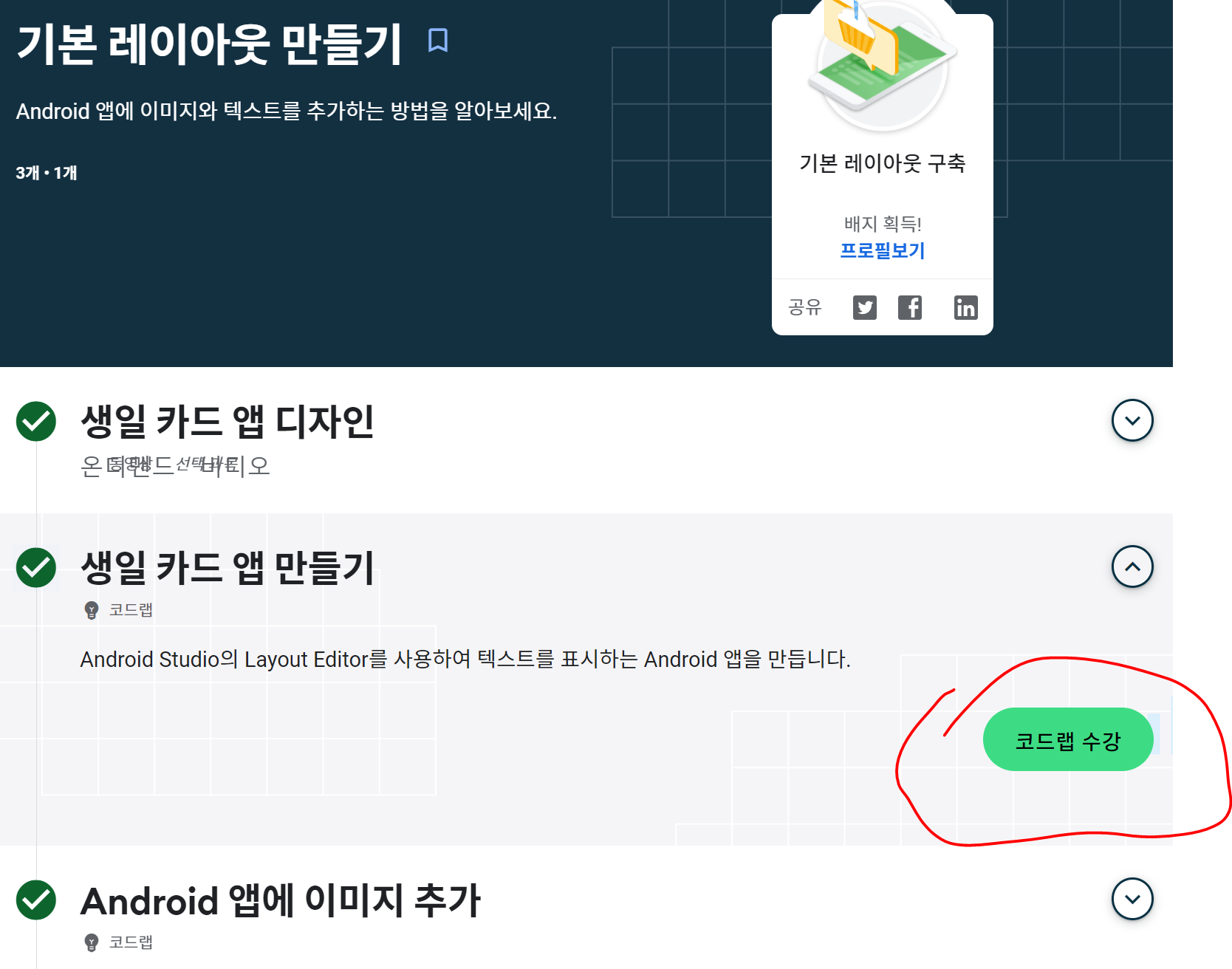탐구하다 버튼을 눌러보면, 생일 카드 앱 디자인, 생일 카드 앱 만들기, Android 앱에 이미지 추가에 대한 내용이 있습니다. 첫번 째 생일 카드 앱 디자인은 이번 학습에서는 어떤 걸 학습할 것인지 알려주는 유튜브 영상입니다. 요약하자면 생일 축하하는 문구와 이미지를 보여주는 앱을 만들겠다는 내용입니다. 저는 바로 생일 카드 앱 만들기로 가보겠습니다.