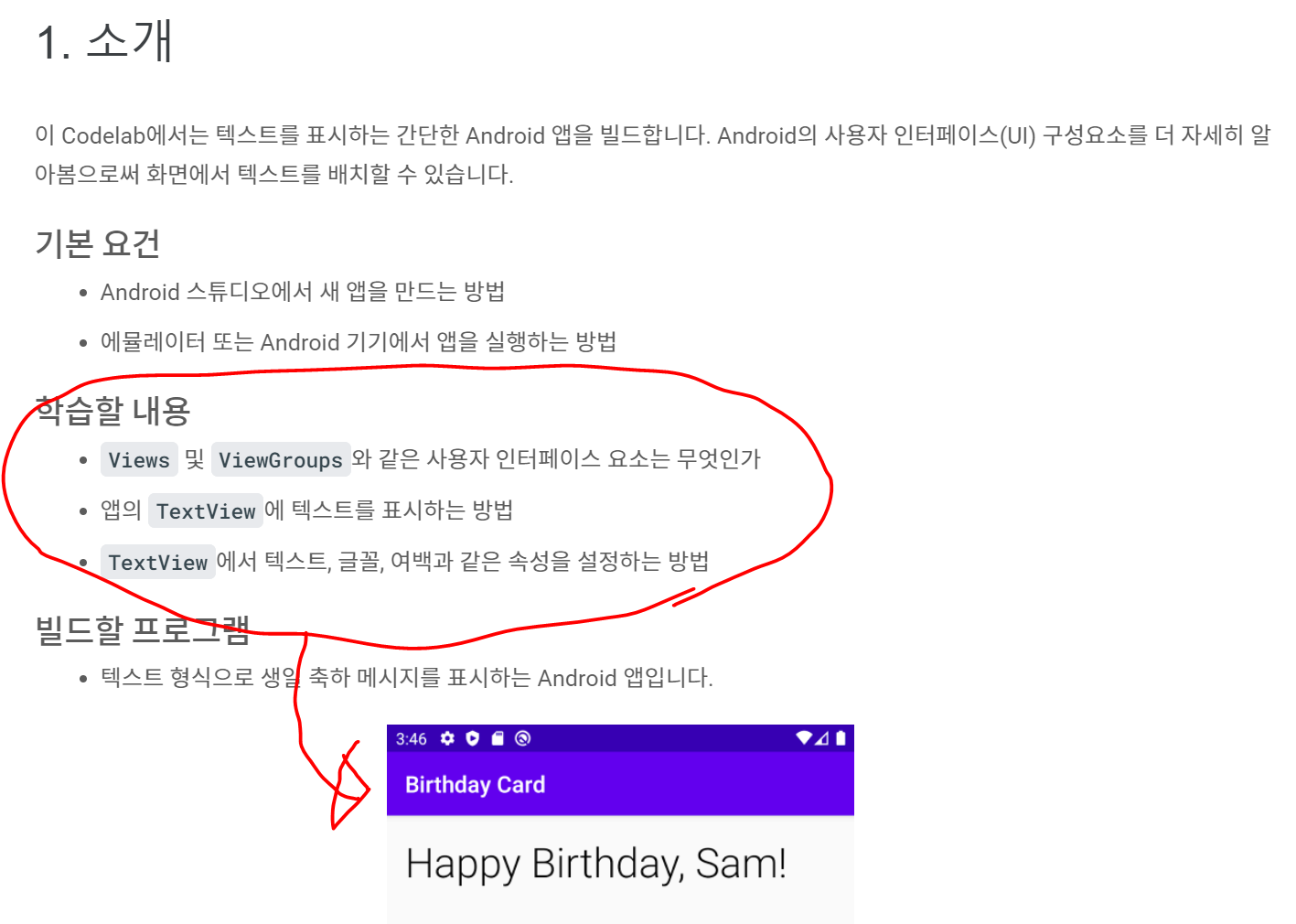 이번에 학습할 내용에 Views, ViewGroups, TextView 이런 단어들이 보입니다. 저런 단어들과 개념을 이해하면 저기 보이는 Happy Birthday, Sam! 이라는 문구를 작성하고 보여줄 수 있는 거 같습니다. 다음으로 넘어가 보겠습니다.