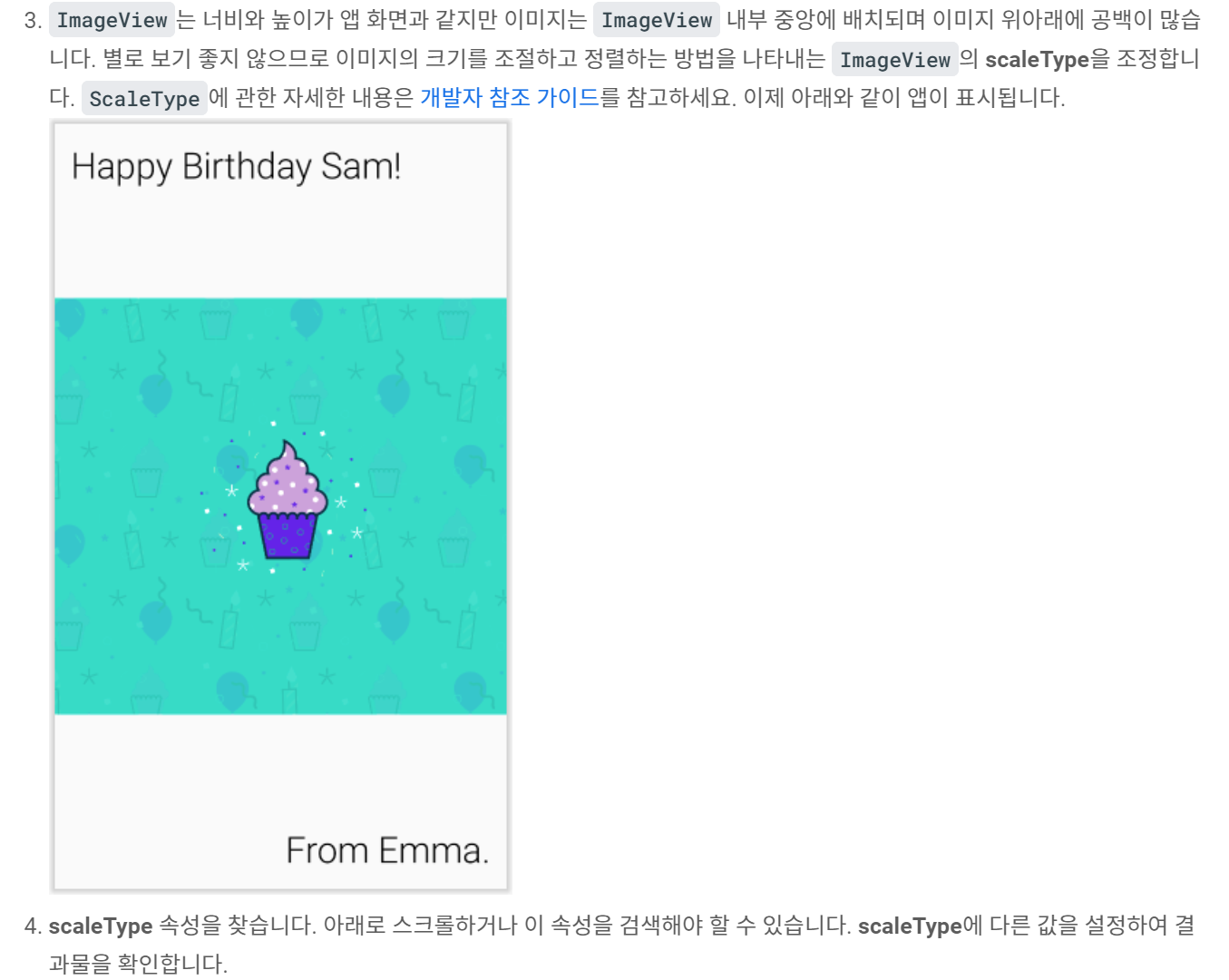 이것저것 눌러보면서 삽질도 좀 하다 보면, 가이드대로 아래 그림처럼 글자와 이미지가 보이게 됩니다. 내가 만들고자 하는 앱에서 이미지가 가운데에만 보이게 하는 거라면, 여기서 끝내면 되겠지만 내가 의도하는 화면은 이미지가 뒷배경 전체에 보이게 하고 싶다면 다른 설정을 또 건드려봐야 합니다. 이런 내용은 사이트에 접속해서 따라 하시면 내용이 또 있습니다.