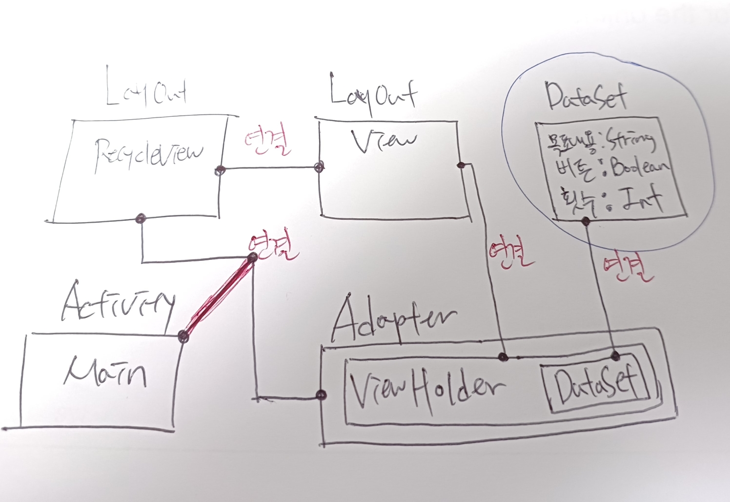 이 글에서는 이 정도까지만 설명하는 게 좋을 것 같다. 다음 포스팅은 왜 저만큼 연결을 해줘야 하는지에 대한 이유를 설명하고 RecycleView 3부에서는 실제 코딩으로 구현하는 것까지 남겨보겠다.
