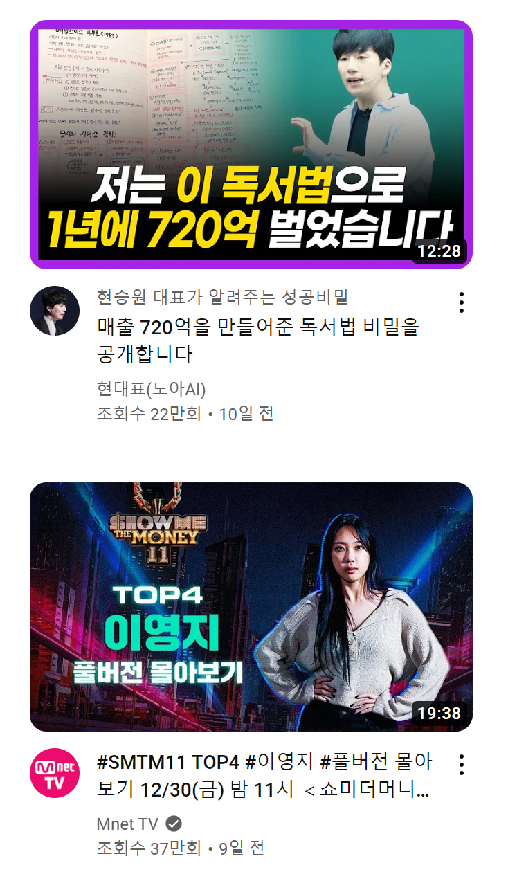 RecycleView는 말 그대로 뷰를 재사용한다는 것이다. 우리가 매일 보는 유튜브로 예를 들어 설명해 본다. 아래 그림을 한번 살펴보자. 내 눈에는 5가지 정보가 보인다.