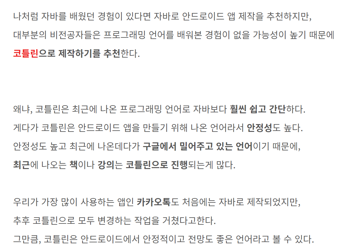 글을 다 읽어보니, 정말 말 그대로 비공전자가 느낀 점 들이 정리가 되어 있었고 안드로이드 앱은 자바나 코틀린 둘 중 하나를 배우면 된다는 말이 있습니다. 자바나 코틀린 둘 중 하나를 배우면 된다는데 이것들이 무엇인지 감이 잘 안 오니까 자바, 코틀린에 대해 알아봐야겠습니다. 마침 해당 블로그에 같이 읽으면 좋은 글로 어떤 언어를 배워야 할까?라는 글이 있어서 해당 글도 읽어 보겠습니다.