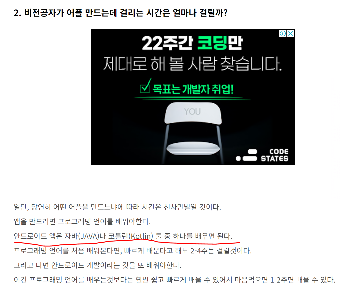 쭉 스크롤 내려보다 보니, "비전공자의 안드로이드 어플 만들기 프로젝트 (앱 개발 후기)" 이런 글이 눈에 들어와서 해당 글을 읽어보면서 감을 잡아보겠습니다.