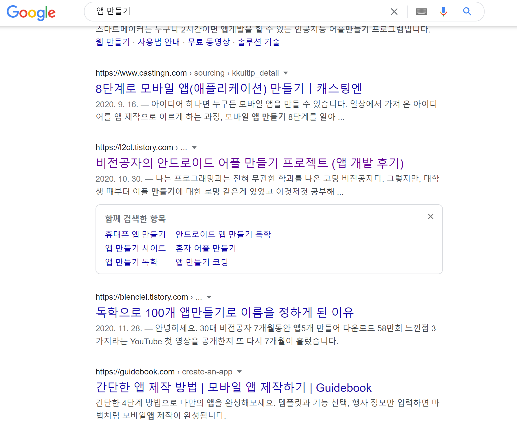 우선 모든 독학의 기본은 검색이죠! 구글에 "앱 만들기"를 검색해보겠습니다.