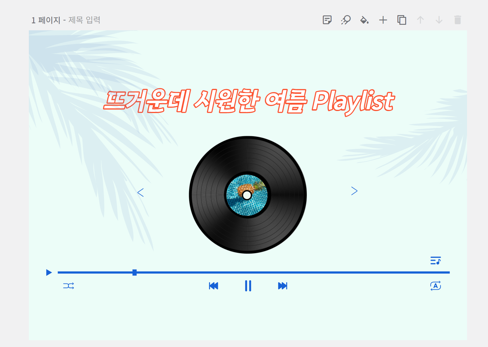 저는 유튜브에 썸네일을 클릭하였고, 음악을 좋아해서 플레이리스트 느낌 나는 썸네일 템플릿을 골랐습니다. 이제 여기서 안에 그림들을 하나씩 클릭해서 원하는 문구나 사진의 위치를 변경하여 입맛대로 변경할 수 있습니다. 작업을 마친 후 우측 상단에 다운로드 버튼을 클릭하시면, 바로 사진 파일로도 다운로드되어 매우 편합니다.