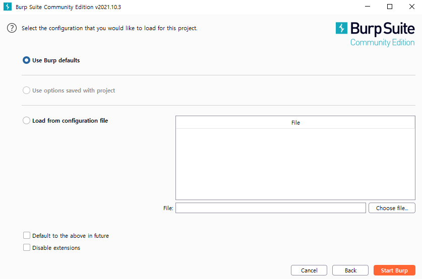 해당 화면 또한 저희가 기존에 설정해둔 설정파일 같은 것이 없기 때문에 Use Burp defaults로 선택 후 Start Burp를 눌러줍니다.
